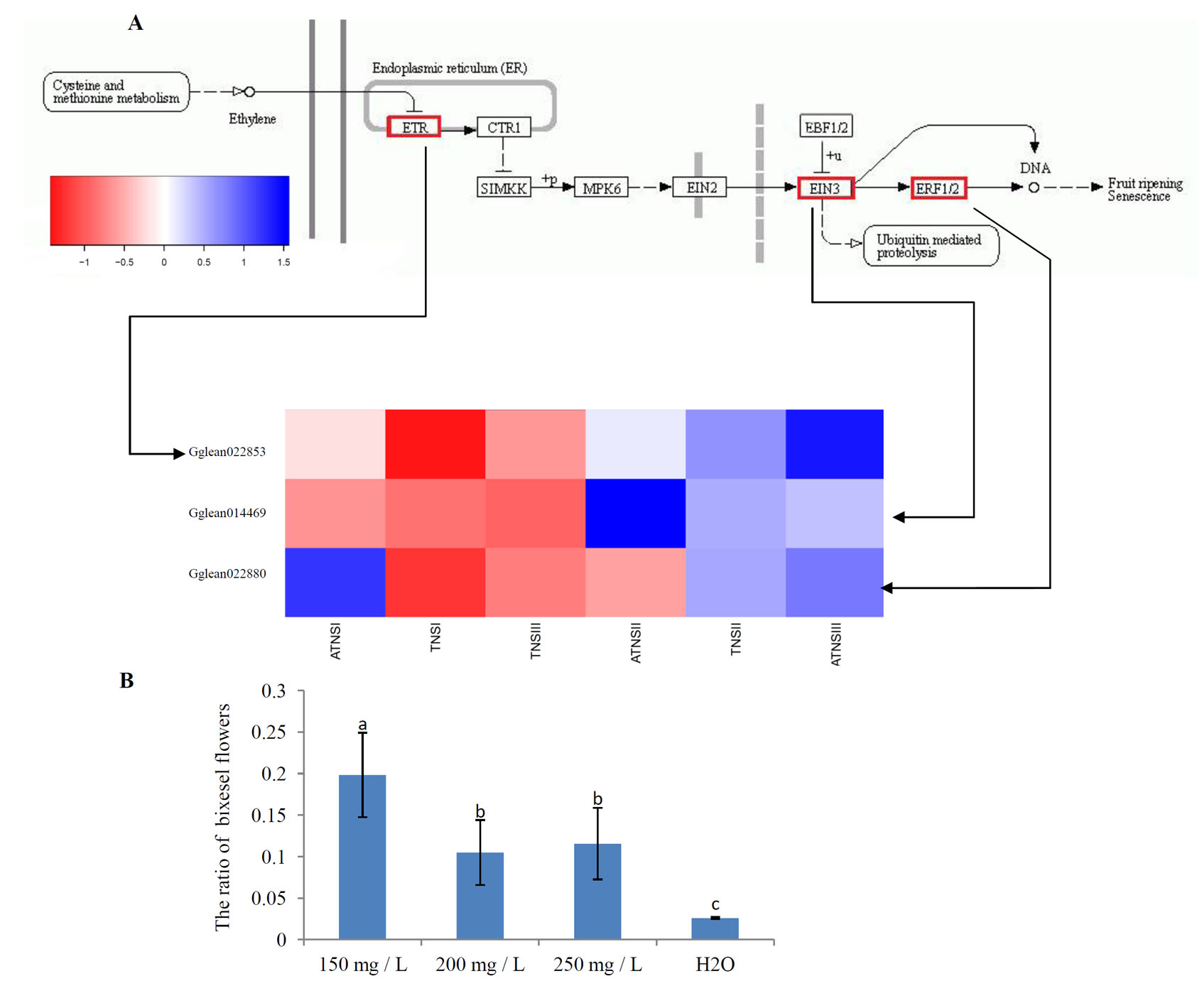 Figure 2 Expression of candidate genes involved in ethylene signal transduction. And effects of different concentrations of ethylene on the ratio of bisexual flowers.