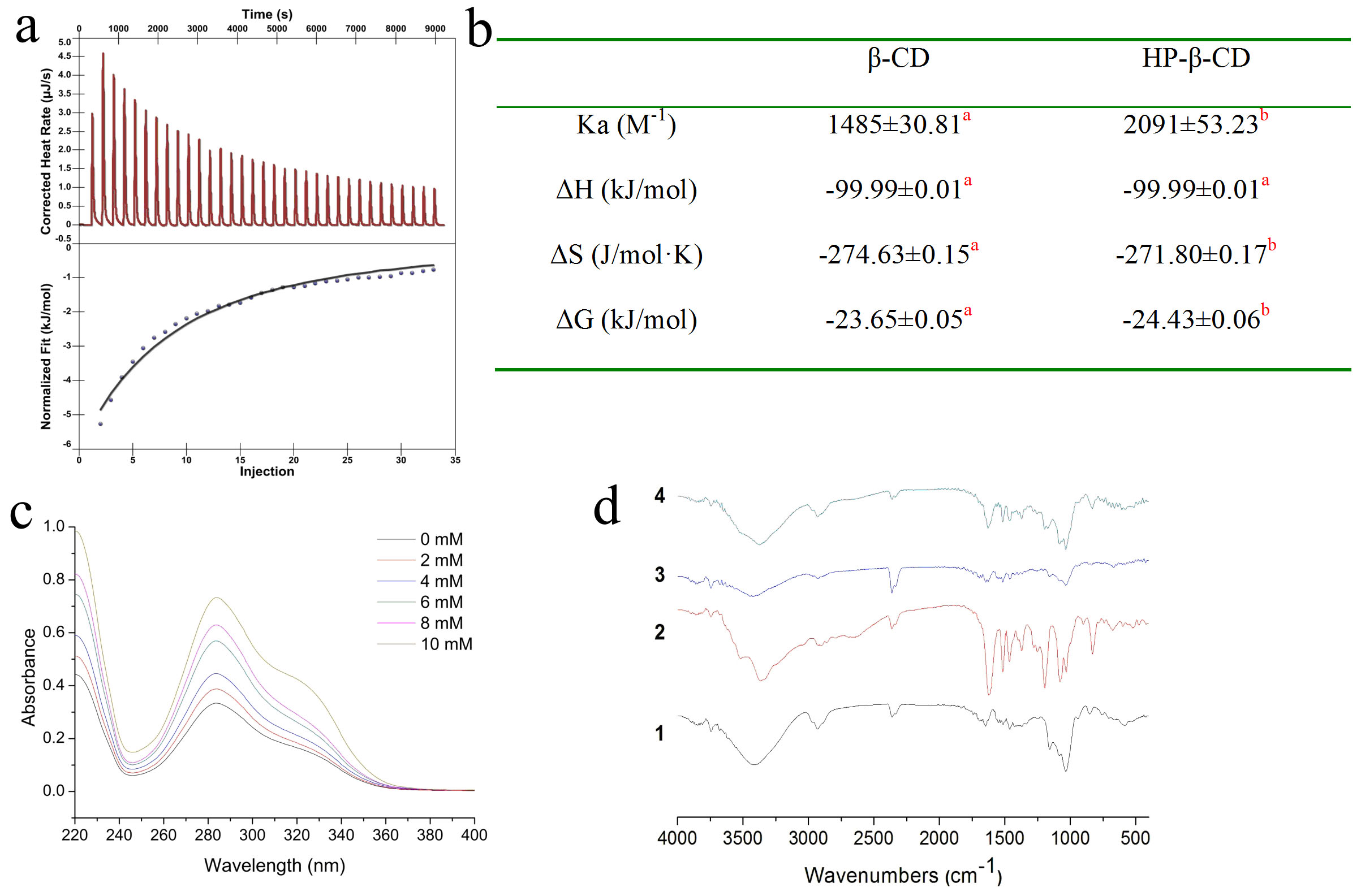 Figure1.The results of ITC(a,b),UV (c)and FT-IR(d)