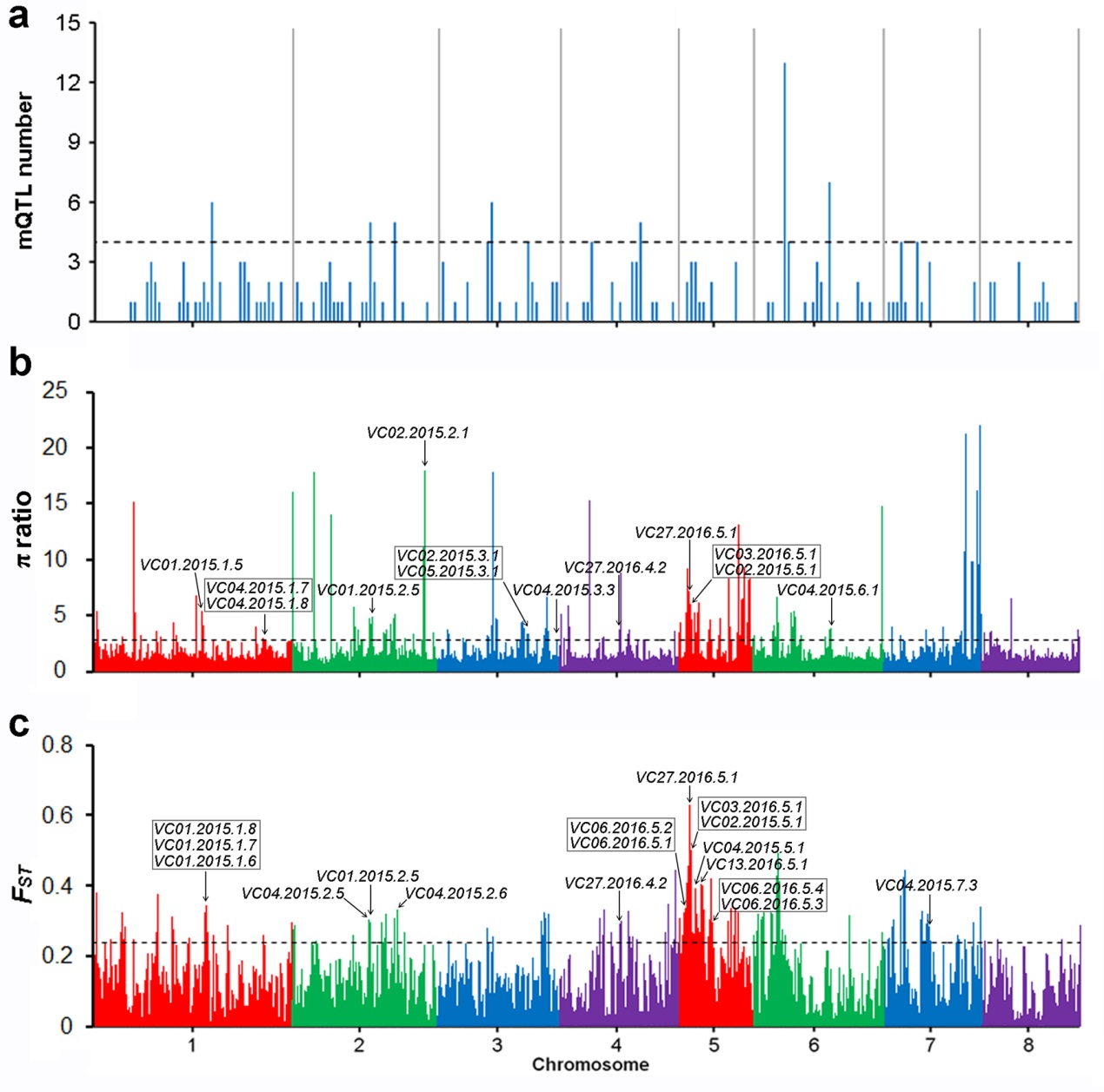 Moreover, in order to verify the effect of assembly, a GWAS of the traits related to volatile substance content was conducted to discover the key genes for the main aroma components in peach fruit. The GWAS generated 83 and 131 QTLs, associated with 23 of the 28 volatiles of germplasm collections evaluated in 2015 and 2016, respectively. We found that 25 QTLs that were associated with seven volatile compounds overlapped with domestication regions (Figure 2).