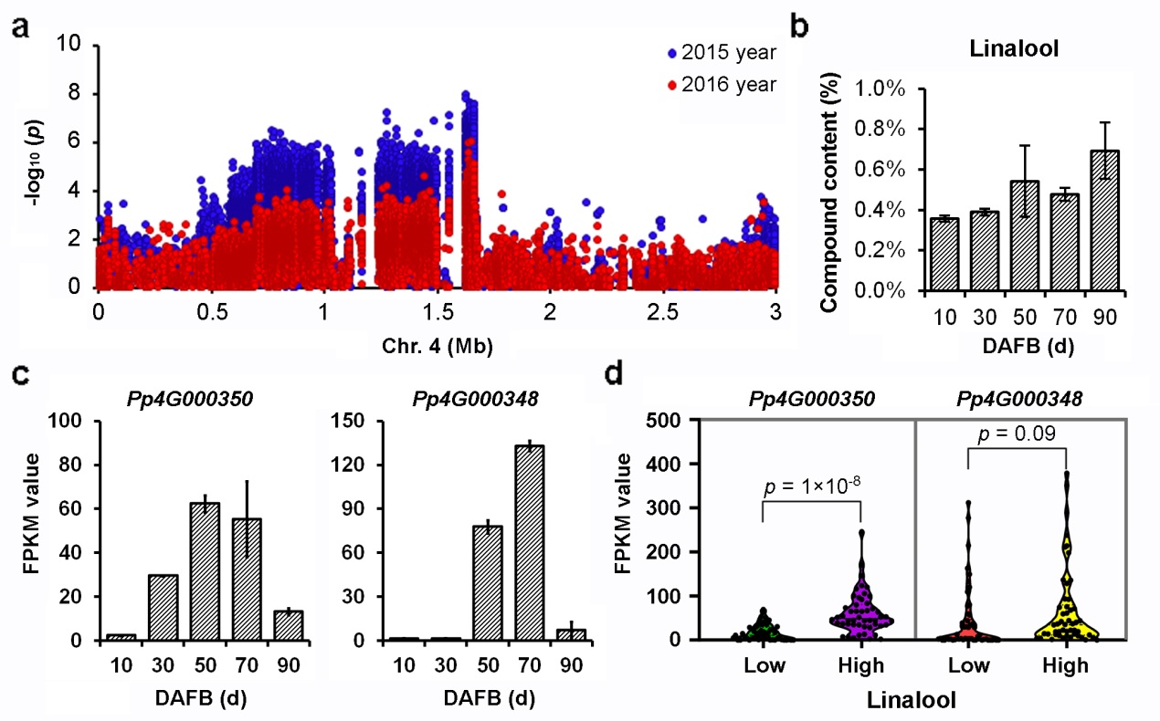 Among all the volatile substances, the monoterpene linalool is recognized as a major contributor to aroma and flavor in peach fruit. Notably, the association signal of the aromatic compound was repeatedly identified in 2015 and in 2016. Within the flanking regions of association regions of linalool content, Pp4G000350 whichencoding terpene synthasewas considered to be a key candidate gene for linalool content after screening the expressed genes during fruit development and genetype analysis (Figure 3).