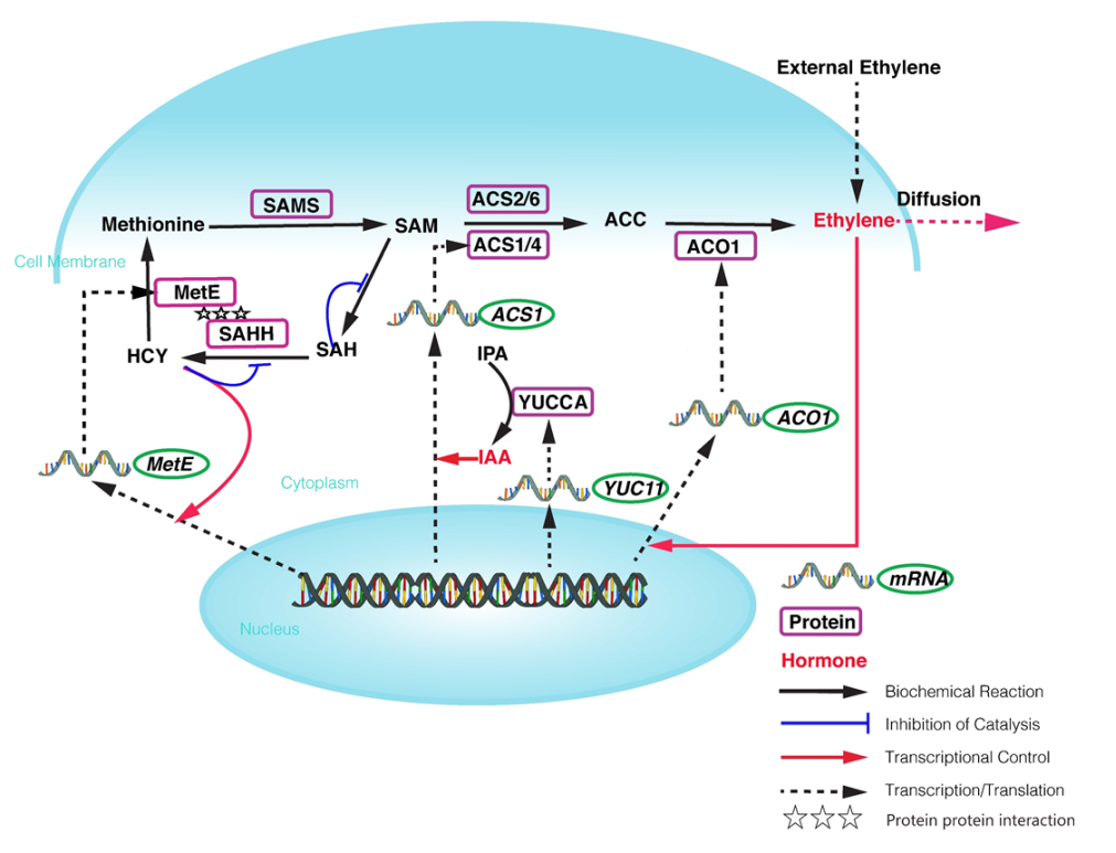 Fig. 2 Biochemical network of the ethylene biosynthesis pathway during fruit-ripening identified from differential proteomic study with mAbarray.