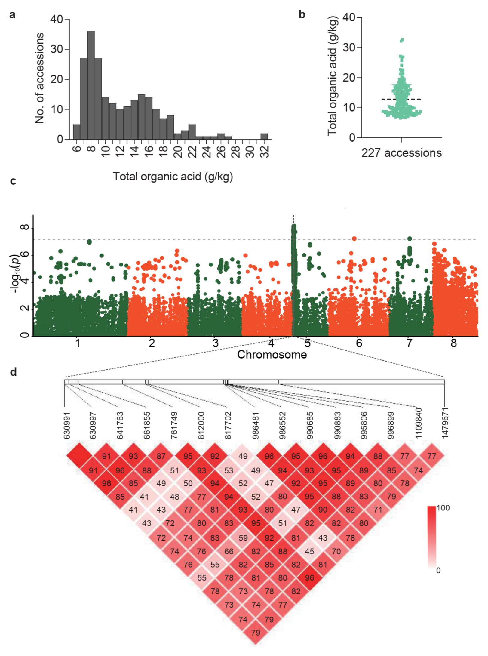 Fig. 1 GWAS identified QTLs associated with organic acid accumulation in peach fruit