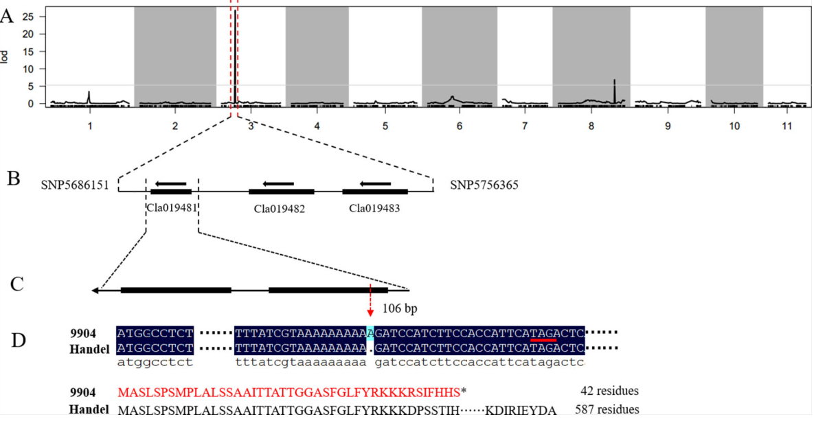 Figure 3 Genetic mapping of the seed coat color gene and candidate gene analysis in watermelon