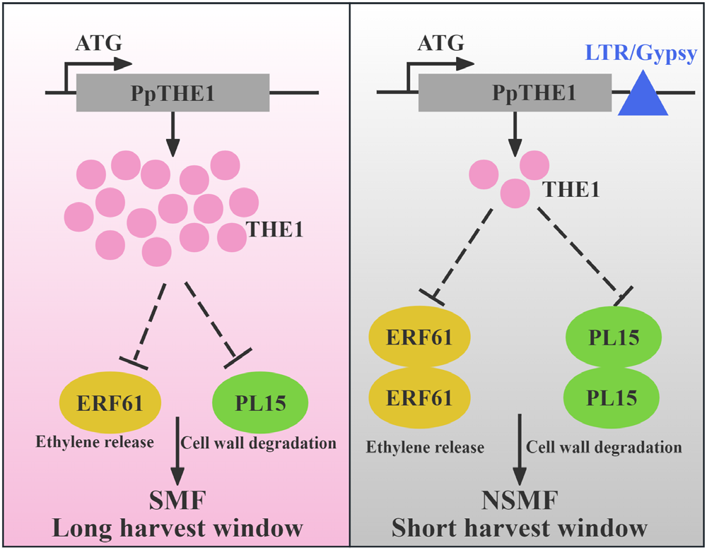 The team constructed a high-quality, chromosome-level genome of SMF peach 'Chun Rui'. Using an F1 segregating population, they mapped the SMF trait to a 1.39 Mb interval on chromosome 4 and identified the candidate gene PpTHE1 with a significantly high expression in SMF fruit. Moreover, they discoved a Gypsy-LTR retrotransposon downstream of PpTHE1 that inhibits its expression. Functional validation through tomato transgenic and peach transient transformation assays confirmed that PpTHE1 negatively regulates the softening of fruit. Subsequently, investigations revealed that the peach fruit softening regulator PpERF61 and the pectate lyase PpPL15 could interact with PpTHE1. PpTHE1 not only suppresses the expression of PpERF61 and PpPL15, but also attenuates the transcriptional activation of downstream target genes by PpERF61. This study provides important genetic resources for improving peach fruit texture.
