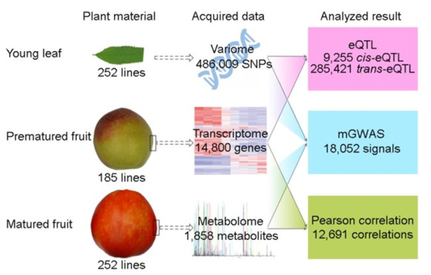 In this study, peach was used as the material, and it was found through multi-omics analysis that flavonoids, an important nutrient in the fruit, showed a downward trend in the evolution process with the decrease of bitter taste. By analyzing the environmental information of original habitats of different landraces, it was found that amino acids played an important role in peach's response to low temperature and drought stress. At the same time, the key genes involved in flavonoid and valine synthesis were discovered, which laid the foundation for functional and resistant fruit breeding.