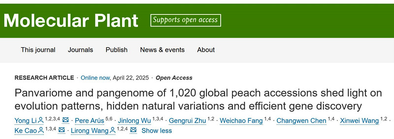 On April 22, the peach resources and breeding group at the Zhengzhou Fruit Research Institute, Chinese Academy of Agricultural Sciences (CAAS), announced a landmark achievement: the construction of the world’s first comprehensive peach pan-variome atlas. This study identified 70.6% novel genomic variants and 3,289 previously unannotated genes, systematically elucidating global phylogenetic relationships and evolutionary trajectories of peach. The team also pioneered a panvariome-based genome-wide association study (GWASPV) strategy, enabling "one-step localization" of agronomic trait-associated genes and functional variants. This innovation significantly enhances gene discovery efficiency in woody fruit crops and provides robust theoretical and technical support for molecular breeding in peach. The findings were published as an article in theMolecular Plant.