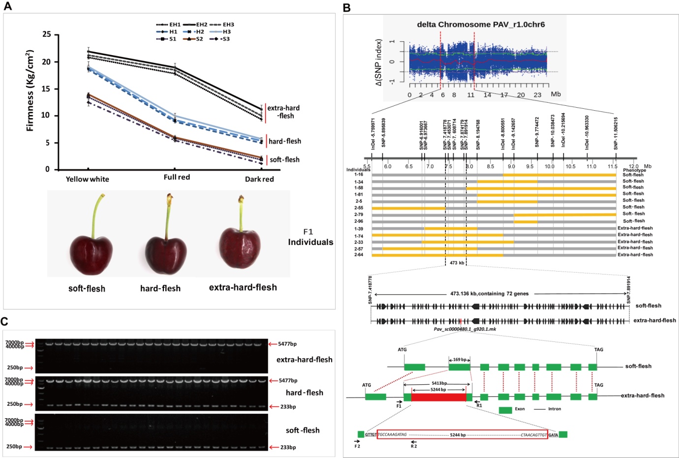 Recently, the researchers from Zhengzhou Fruit Research Institute successfully localized and cloned PavSCPL , a gene controlling sweet cherry fruit firmness through forward genetics, and analyzed its molecular function. The identification of PavSCPL provides a novel and invaluable genetic resource with potential for improvement of fruit firmness and present useful molecular markers for molecular-assisted breeding for fruit firmness in sweet cherry.The results were published in Plant Biotechnology Journal. Identification of the candidate gene PavSCPL controlling fruit firmness and co-segregation analysis for genotyping of the PavSCPL alleles with fruit firmness in F1 population F...