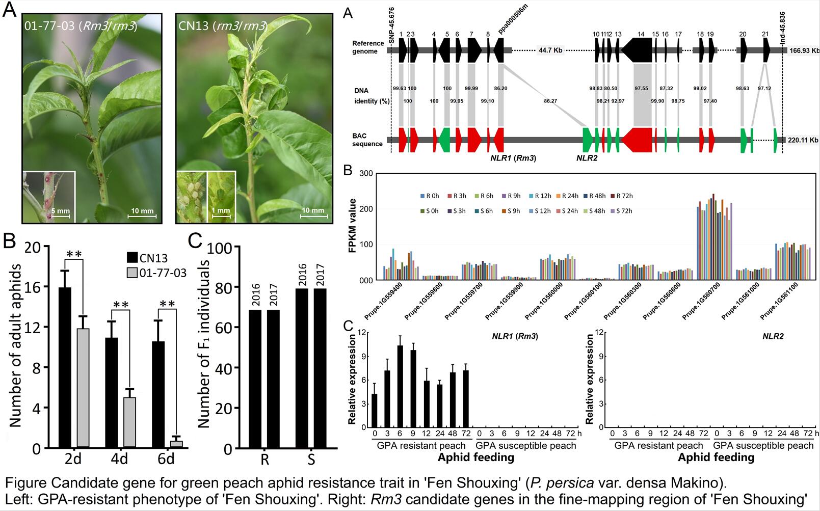 Source: Zhengzhou Fruit Research Institute Recently, a paper entitled “The NLR gene Rm3is a strong candidate gene for the dominant green peach aphid (Myzus persicae Sülzer) resistance trait in peach” was published by Journal of Experimental Botany. In the paper, ZZFRI researchers report the genetic analysis and cloning of the first resistance gene Rm3 for M. persicaeinpeach. Findings provide new insights into the genetic mechanism underlying insectresistance intree plants and uncover a useful diagnostic tool for early seedling selection in peach breeding programmes. Bulk segregant analysis (BSA) mapping in a segregating progeny delimited Rm3 to an interval spanning 160 Kb containing 21 g...