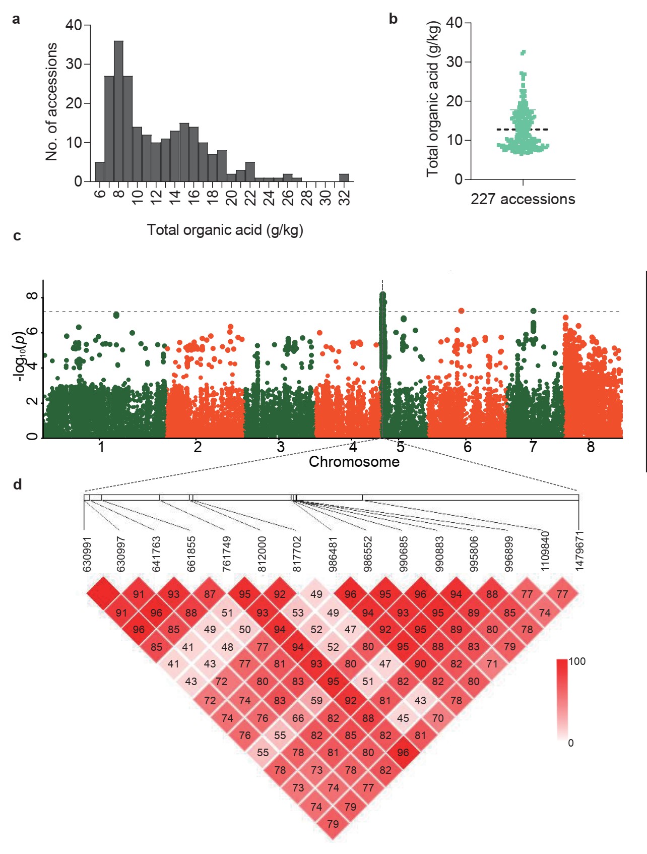 Recently,Lirong Wang and her team from Zhengzhou Fruit Research Institute, the Chinese Academy of Agricultural Sciences (CAAS) revealed reported a key gene, PpTST1, for organic acid accumulation in peach. The study was published in Horticulture Research. Fig. 1 GWAS identified QTLs associated with organic acid accumulation in peach fruit Organic acids are important determinants of peach organoleptic quality. The accurate regulation of organic acid content is an important objective of peach breeding. Therefore, it is of great significance to elucidate the regulation mechanism of organic acid accumulation. Previous studies have found that organic acid content is controlled by multiple gene...