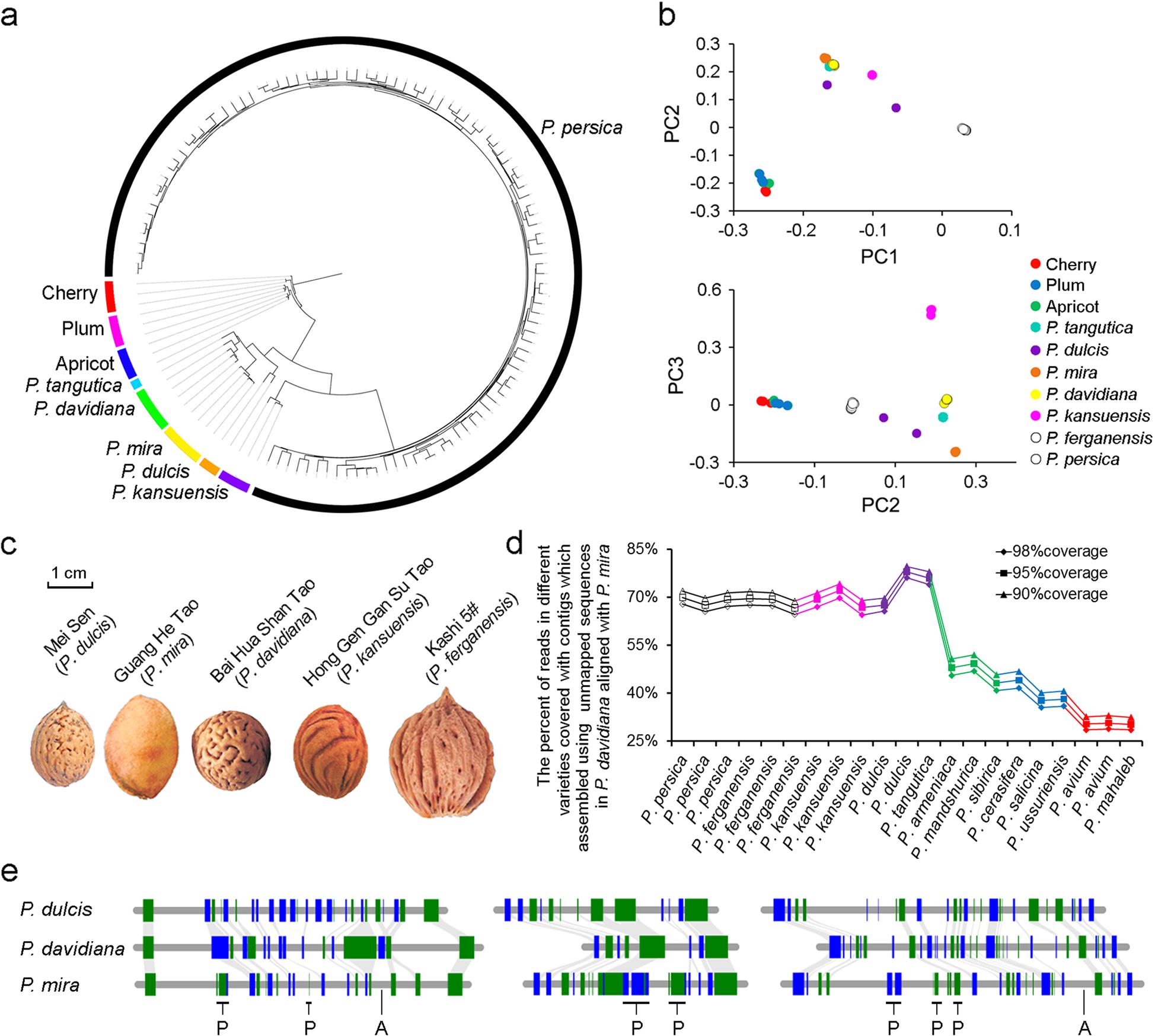 Recently, the peach Resources and Breeding Innovation team of Zhengzhou Fruit Research Institute, Chinese Academy of Agricultural Sciences, in cooperation with domestic and foreign research teams, released the high-quality pan-genome of wild peach species, and identified the resistance genes of wild peach species, which is of great significance to the peach industry structure adjustment, green development and ‘going up the mountain and down the beach’. The results are published in BMC Biology (JCR 1, Impact factor 7.431). Peach and its four wild relatives are distributed in a large number of natural populations in China.P. mira is mainly distributed in the Qinghai-Tibet Plateau,P. kansuensi...