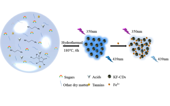 The team of fruit quality safety control technical is committed to developing multifunctional nanomaterialsfrom biomass carbon sources. This team used kiwi as biomass carbon sources to synthesize a newfluorescent nanomaterials (KF-CDs) that have the great potential in the sensitive detected of Fe3+. From the fluorescence interference experiment, it was obviously quenched by Fe3+ within seconds, and have a good linear relationship between 1-33.8 μmol/L, the linear equation was y=""0.9546+0.0689x"" (R=""0.996),"" and the detection limit was 0.097 μmol/L. The WHO stipulated that Fe3+ in drinking water should not exceed 0.3mg/L (∼5.36 μmol/L). This work was supported bythe Agricultural Science ...