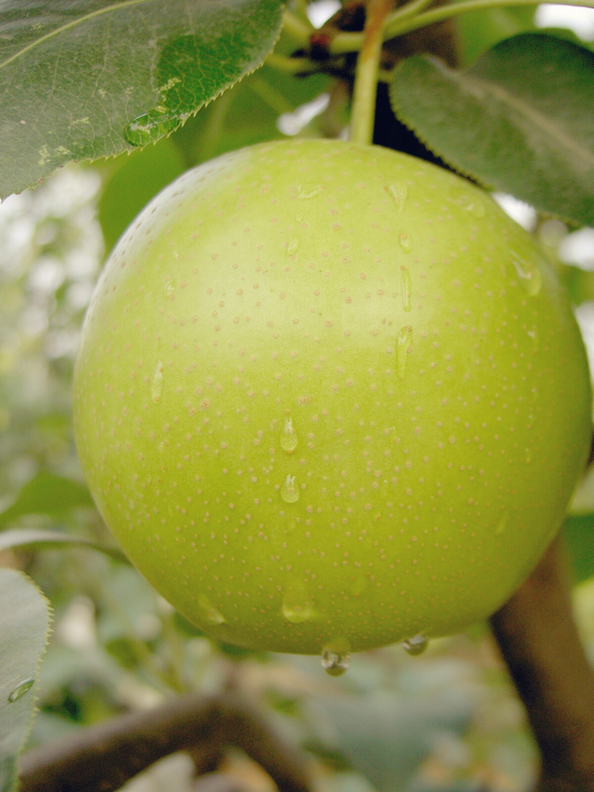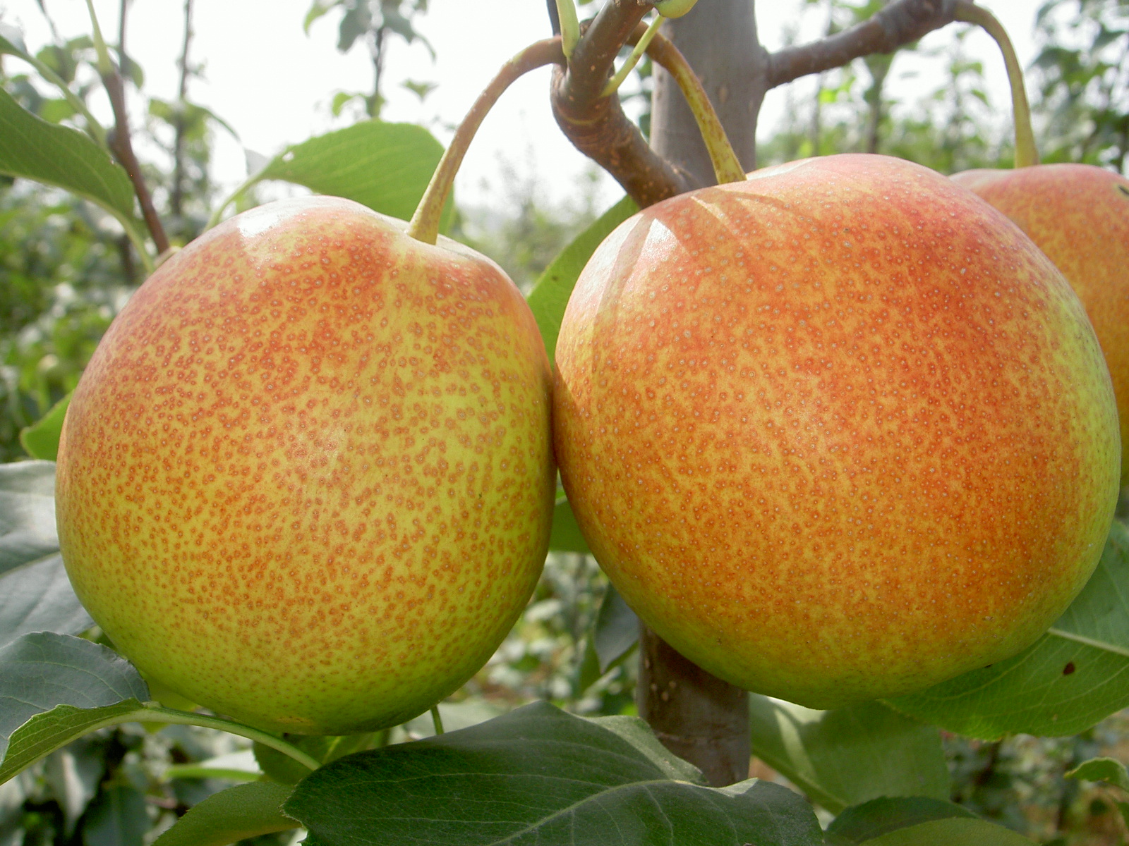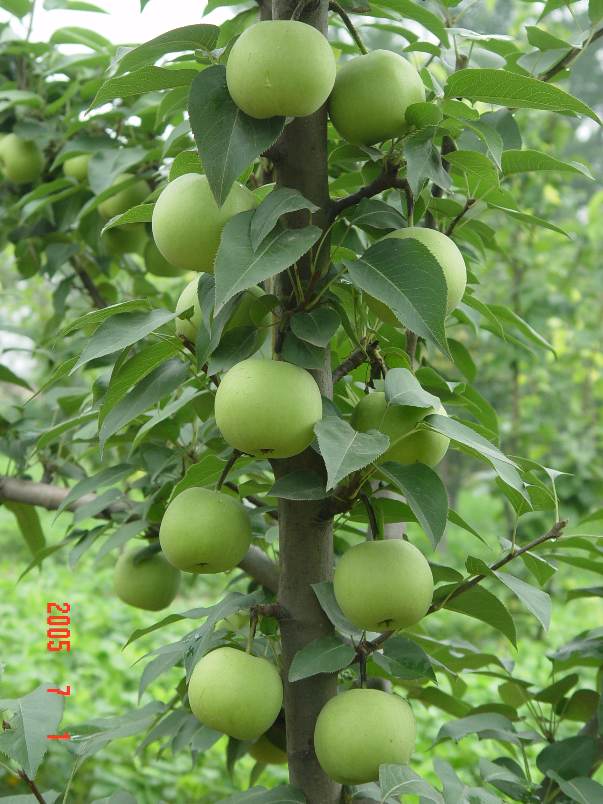 Main characters The fruit shape is oblate with beautiful appearance and good quality, green skin, 250g per fruit, over 20 days shelf life . The flesh is fine, tender and crisp, juicy, sweet; TSS 12.2%~14.3%, total acid 0.085%, vitamin C 3.85 mg/100g . It matures in mid-July in Zhengzhou City, Henan Province. The trees are vigorous, productive, early precocity, and resistant to pear scab disease.