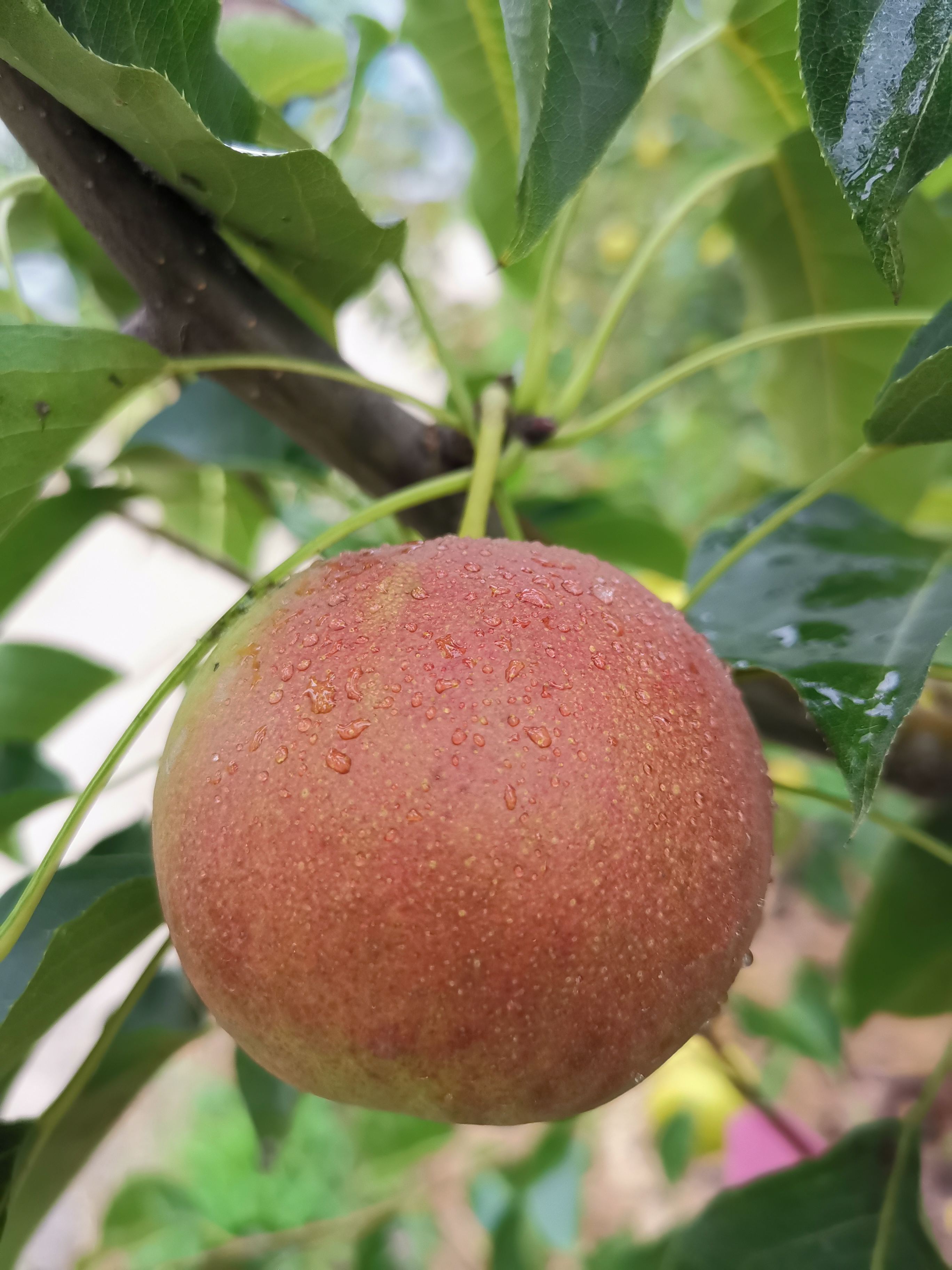 Main characters The fruit shape is round with attractive appearance and good quality, green skin covered with almost all bright red, 200g per fruit. The flesh is white, fine, crisp, juicy, sweet; TSS 12.5%. It matures in early September in Zhengzhou, Henan Province.
