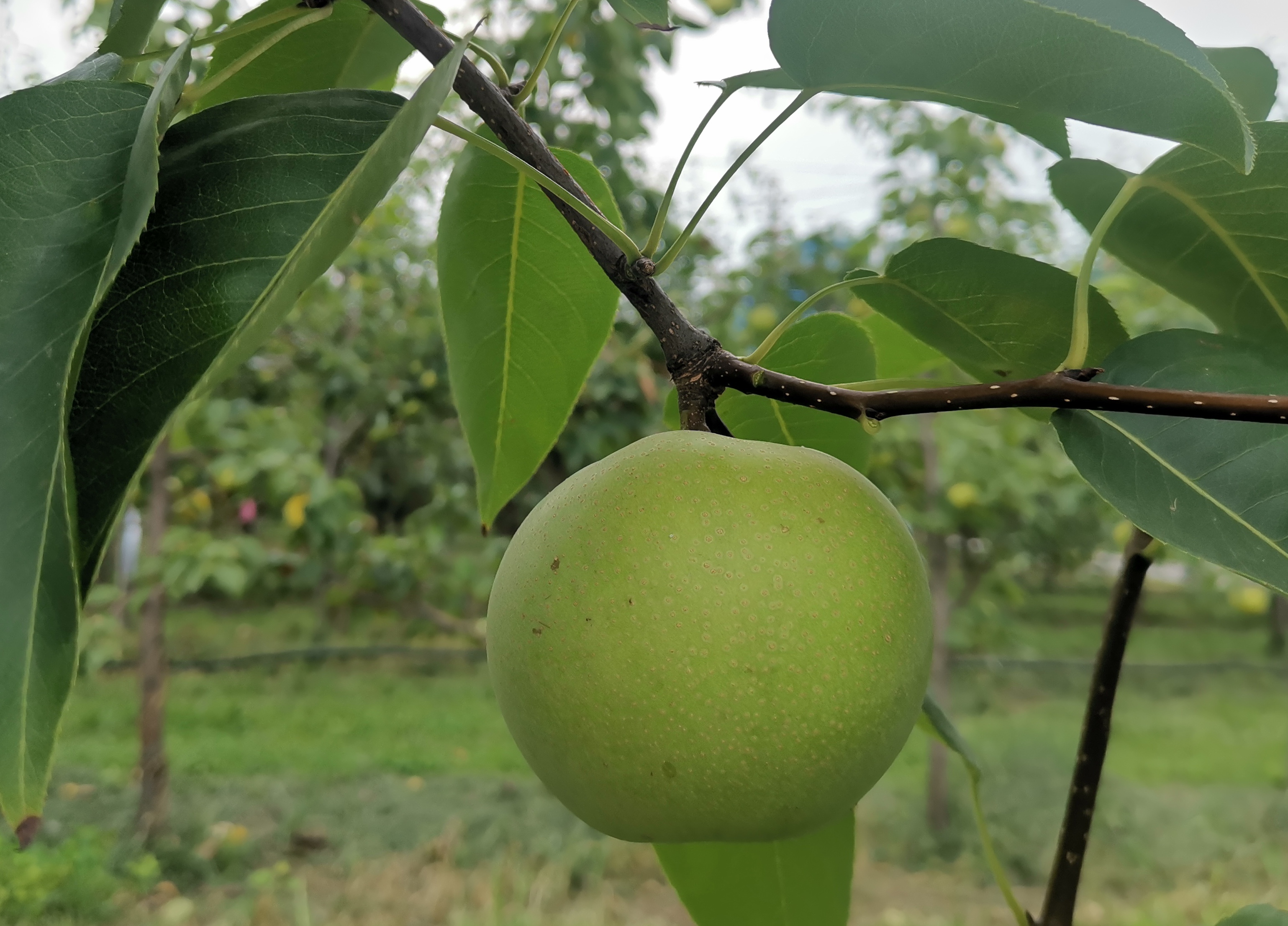 Main characters The fruit shape is sub-round with beautiful appearance and good quality, green skin and small dense dots, 300g per fruit. The flesh is fine, creamy white, crisp, juicy, sweet-tiny sour, rich flavor; TSS 12.8%,small core. It matures in early or mid July in Zhengzhou City, Henan Province.