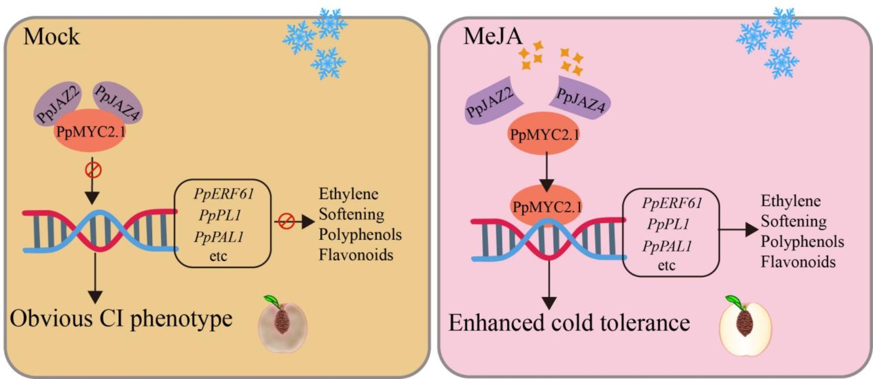 MeJA作为植物体内重要的信号分子,在调控胞内信号转导、促进植物生长及响应多种环境胁迫等生理过程中发挥关键作用。已有研究表明,采后外源施加MeJA能够有效提升桃等多种果实的低温耐受性。然而,其内在的分子调控机制尚待深入阐明。