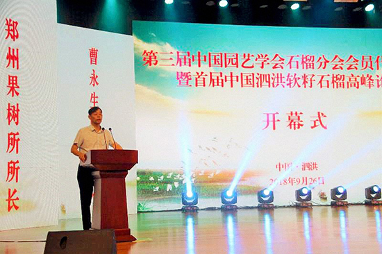 9月26日,第三届中国园艺学会石榴分会会员代表大会暨首届中国泗洪软籽石榴高峰论坛在江苏泗洪召开,中国农业科学院郑州果树研究所所长曹永生出席开幕式并讲话。江苏省农委副主任蔡恒、江苏省林科院副院长孙体如、宿迁市农委主任王占武、宿迁市林业局局长朱耀、泗洪县委副书记武联等领导,以及来自全国13个省份的220余名代表参加会议。